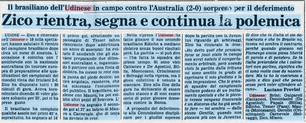 Accadde Oggi: L'Udinese di Zico gioca contro l'Australia: il Galinho entra e segna