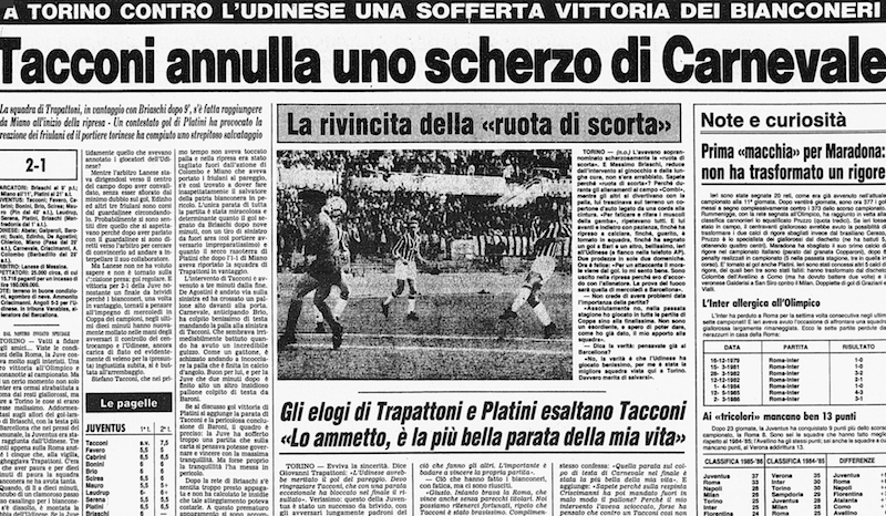 La Juve vince 2-1 sull'Udinese: Tacconi annulla uno scherzo di Carnevale. E' il 28 febbraio 1986