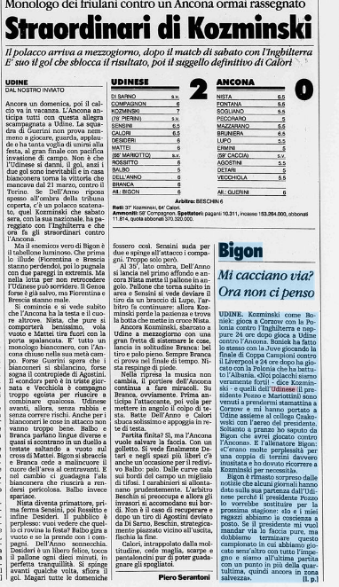 La corsa salvezza è infuocata, ma l'Udinese batte l'Ancona 2-0 e tiene il passo. Bigon non parla intanto del suo futuro. E' il 29 maggio 1993