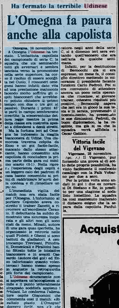 L'Udinese comanda in serie C, ma l'Omegna la ferma. E' il 29 novembre 1978
