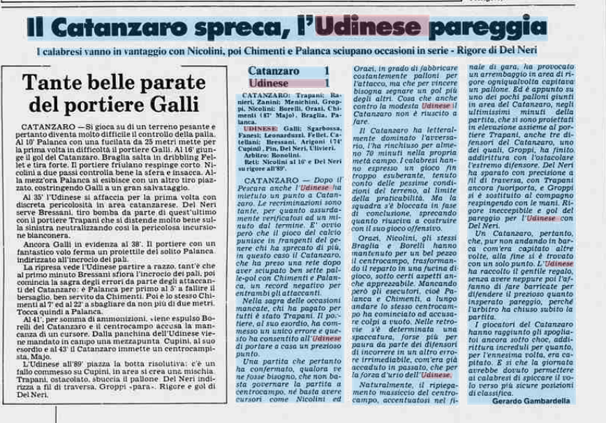 L'Udinese pareggia a Catanzaro dove i padroni di casa sprecano troppo. E' il 29 dicembre 1979