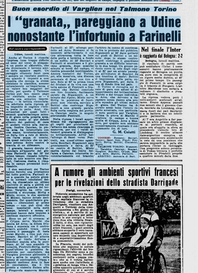 L'Udinese pareggia in casa contro un Torino che la noia qualche giovane. E' il 30 novembre 1958.