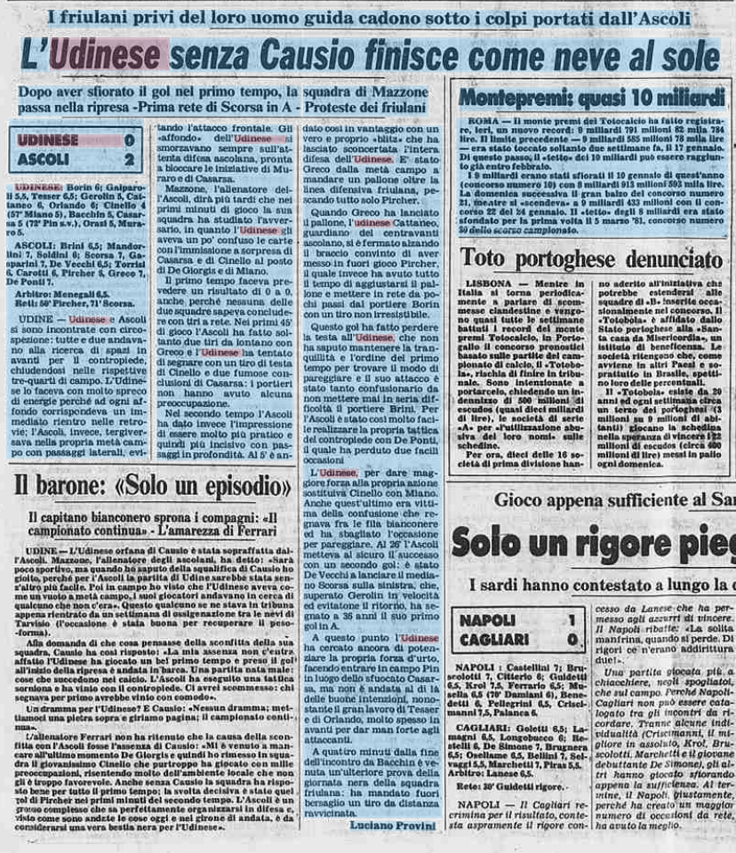 L'Udinese cade malamente in casa contro l'Ascoli: friulani senza Causio e senza idee in mezzo. E' il 30 gennaio 1982