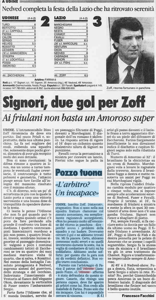 L'Udinese va ko con la Lazio e Pozzo tuona contro l'arbitro a fine gara: è il 31 gennaio 1997