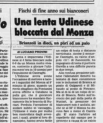 Accadde Oggi, il 31 dicembre 1989, l'Udinese pareggia 0-0 a Monza.Lenta e impacciata l'Udinese si è fatta bloccare sullo 0-0 da un Monza molto vivace, costretto a giocare l'ultima mezz'ora in 10 uomini per l'espulsione di Casiraghi. L'Udinese aveva avuto l'occasione di mettere a tacere i ragazzini del Monza al 9' minuto di gioco, quando un rinvio sbagliato da Fontanini aveva offerto a Catalano la palla gol, che il giocatore bianconero ha mandato fiaccamente fra le braccia di Nuciari. Perduta l'occasione di andare subito in vantaggio, l'Udinese è stata poi molto ben controllata dagli avversari. E per l'Udinese con gli auguri di fine d'anno sono arrivati anche i fischi dei tifosi rimasti delusi.