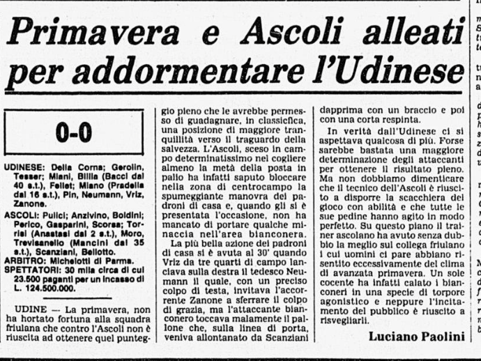 L'Udinese sente l'aria di primavera e fa solo0-0 in casa con l'Ascoli: è il 31 marzo 1981