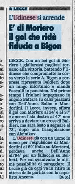 Un gol di Moriero regala la vittoria al Lecce dell'ex Bigon contro l'Udinese. E' il 4 aprile 1992