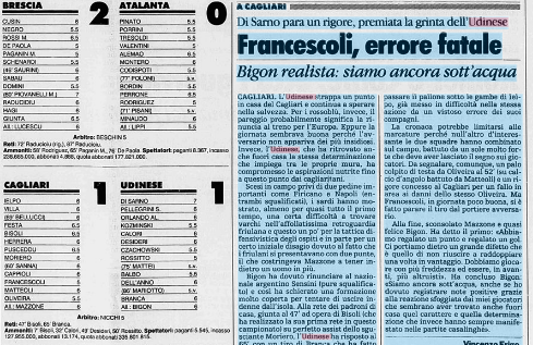 Di Sarno para un rigore a Francescoli e l'Udinese strappa un punto salvezza a Cagliari. E' il 4 maggio 1994
