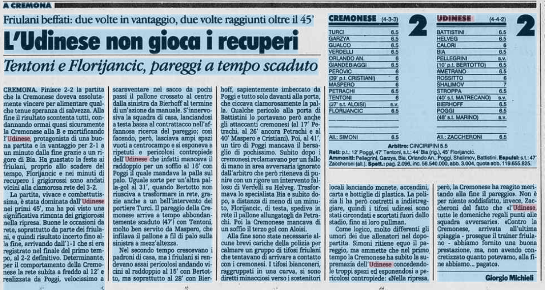 L'Udinese nel recupero viene raggiunta dalla Cremonese: è il 4 febbraio 1996