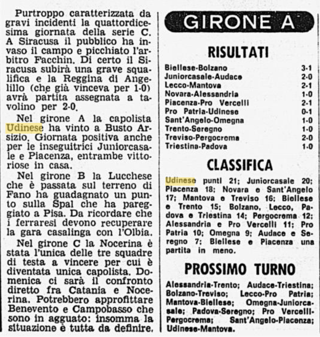 Udinese sempre più in vetta nel campionato di Serie C: è il 6 dicembre 1977