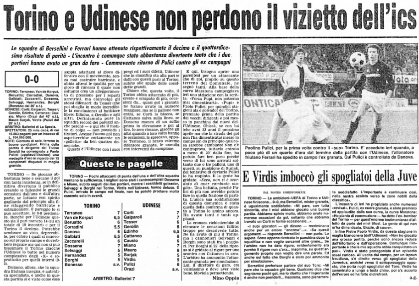 L'Udinese e il Torino sono le squadre che pareggiano di più. nello contro diretto non poteva finire che con una ics. E' il 6 febbraio 1983