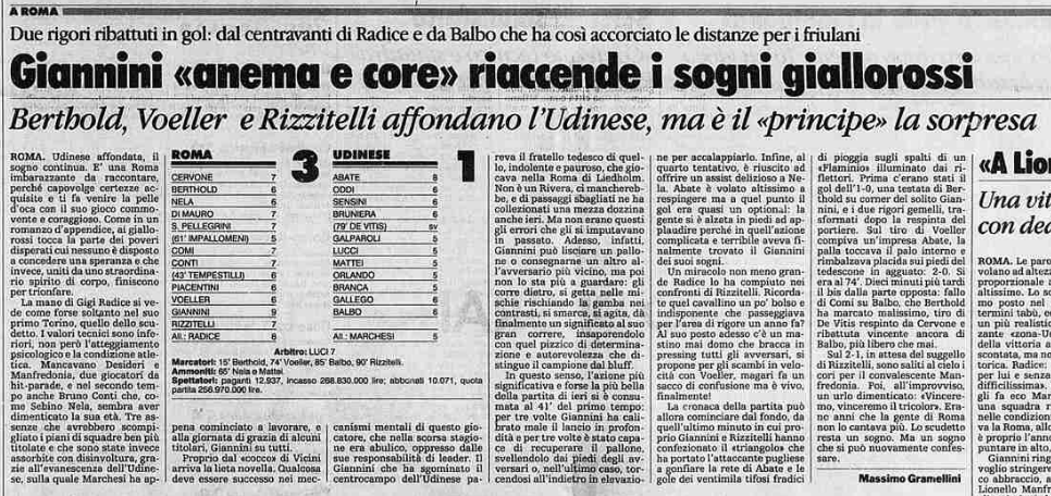 Nulla da fare per l'Udinese contro la Roma: all'Olimpico i bianconeri battuti 3-1. E' il 7 gennaio 1990