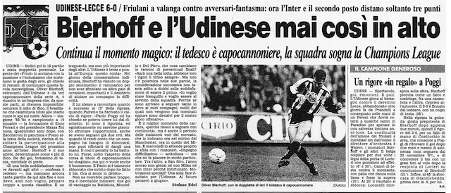 L'Udinese affonda il Lecce con sei reti: bianconeri mai così in alto nella storia. E' il 7 febbraio 1998