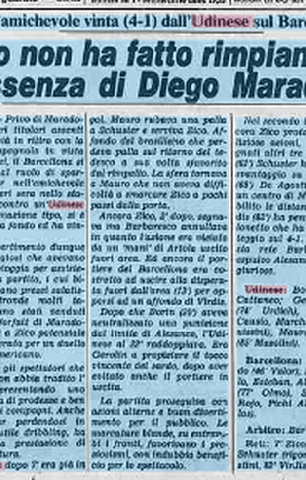 L'Udinese batte in amichevole il Barcellona 4-1, assente Maradona Zico fa magie. E' il 7 maggio1984