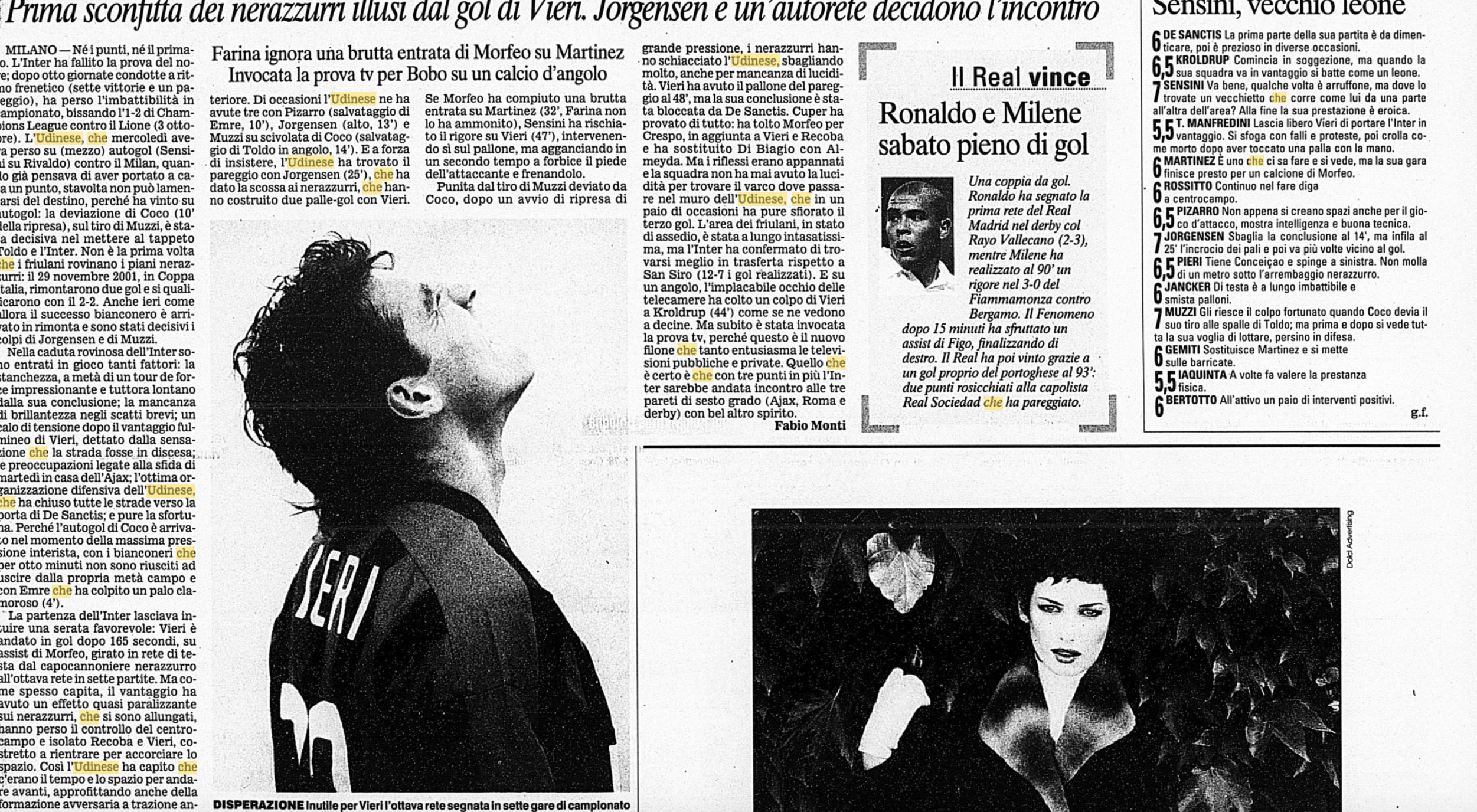 L'Udinese si impone 2-1 a san Siro contro l'Inter fermandone la corsa: è l'8 novembre 2002