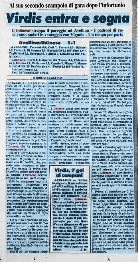 Virdis entra e segna e l'Udinese porta via un pareggio da Avellino: è l'8 gennaio 1983