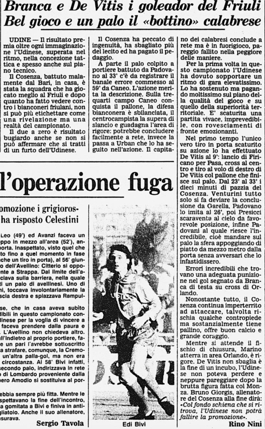 L'Udinese batte il Cosenza e sale al terzo posto in B: è il 9 gennaio 1989.