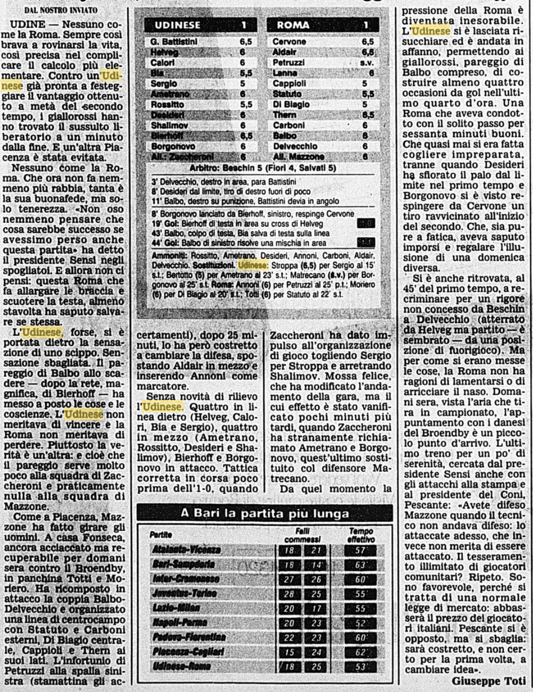 L'Udinese domina ma allo scadere la Roma pareggia. E' il 3 dicembre 1995