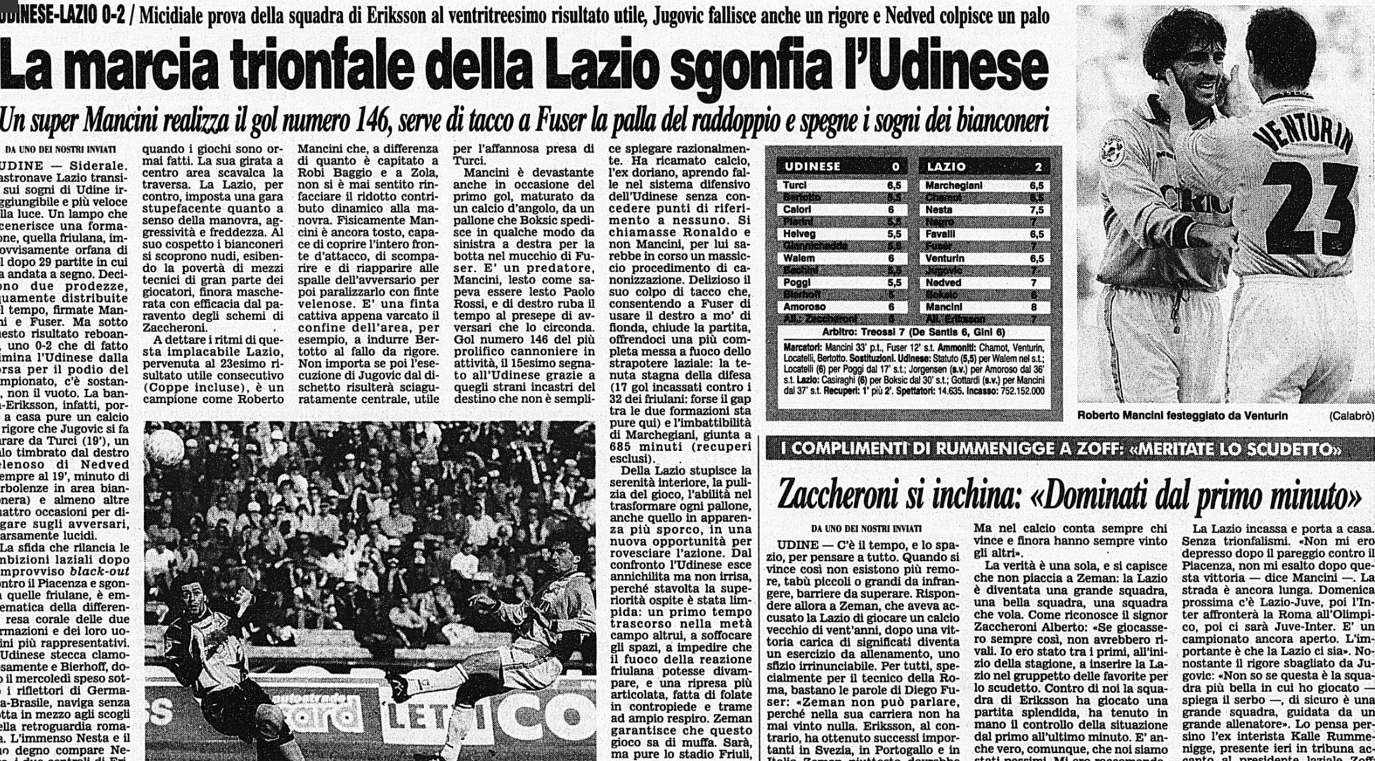 Solo la Lazio di Mancini riesce a fermare la corsa dell'Udinese di Zac: è il 24 marzo 1998