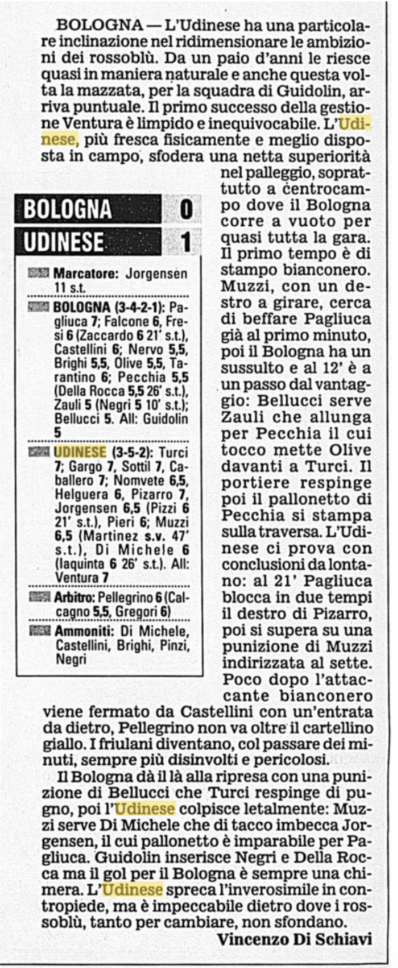 L'Udinese vince a Bologna: è il 15 dicembre 2001 Redazione 16 dicembre - 00:20 Corsera © RIPRODUZIONE RISERVATA Commenta Continua la lettura Commenti Invia Commento Tutti Leggi altri commenti