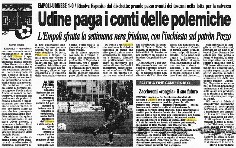 L'Empoli sfrutta la settimana nera friulana con l'inchiesta su Pozzo Redazione 2 marzo - 00:25 © RIPRODUZIONE RISERVATA Commenta Continua la lettura Commenti Invia Commento Tutti Leggi altri commenti
