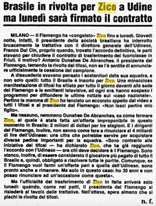 L'affare Udinese-Zico si farà, in Brasile è rivolta. Sono i primi di giugno del 1983