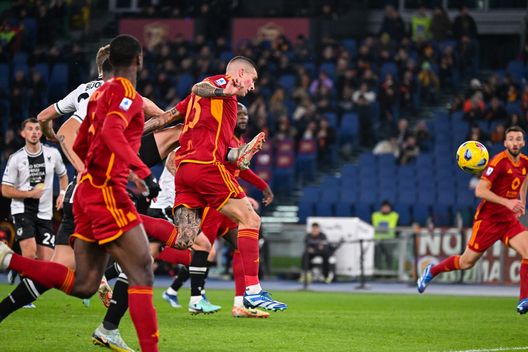 La prima foto del giorno raffigura perfettamente il momento in cui la squadra capitolina si porta in vantaggio. Il cross in mezzo di Paulo Dybala è con il contagiri e Gianluca Mancini non si fa di certo pregare.