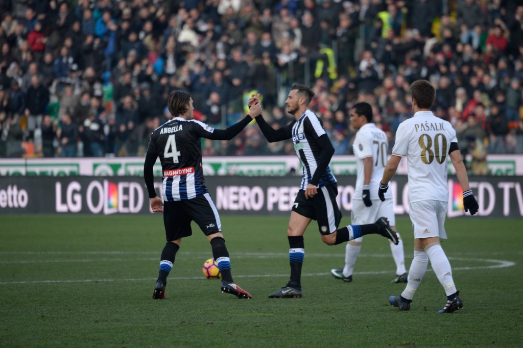 KARNEZIS 7,5 Incolpevole sul gol, nella ripresa rimedia su Bacca, poi altri interventi di rilievoFARAONI 5,5 Ancora terzino destro, nel gol gli scappa l'avversario. Ancora una volta a vuoto. Si infortuna alla mezzora(ANGELLA al 29') 7 Non è un terzino, ma compie il lavoro con dedizione come sempre. Troppo poco utilizzato.FELIPE 7,5 Da centrale fa il suo compito senza errori anche con qualche bella chiusura. Forse il miglior dietro per sicurezza e senso della posizioneDANILO 7 Buoni anticipi su Bacca, attento sempre a chiudere e coprire. Un muroSAMIR 7 A sinistra fa il suo compito senza spingere molto, ma è provvidenziale in alcune chiusure (vedi Suso)FOFANA 5,5 Il pupillo di Delneri è in fase di involuzione. Serve dargli fiato A volte parte bene con la palla ai piedi, ma non sa scegliere i tempi per cercare i compagni(ADNAN al 75') SvHALLFREDSSON 7 Confermato a discapito di Kums, imposta, difende e quando trova spazi è irresistibile e suo è l'assist per ThereauJANKTO 7 Corre e si danna, ma non riesce a costruire molto. Già che altro controlla la sua zona.DE PAUL 7 Sembra eterno incompiuto. Insistiamo a paragonarlo all'Ortega dell'Udinese. Con un fallo inutile e rischioso (forse da rosso). Poi un gol che vale oro.(HURTAUX Al 90') SvZAPATA 6 Corre come un treno, ma nell calcio un vecchio allenatore mi disse: "chi corre meno e fa più gol è un campione". Ma si sacrifica molto e questo è un pregio.THEREAU 7,5 Problemi al ginocchio per il francese. Ma col Milan sa subito inserirsi e trovare la prima vera occasione. Poi segna alla mezzora un pari importantissimo.