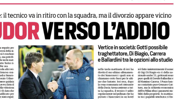 Va anche ricordato che Tudor nella tarda mattinata di ieri ha diretto il suo ultimo allenamento dei bianconeri i quali non si chiamano certo fuori per le ultime due batoste. Ieri sera, dopo la cena consumata nel ristorante della Dacia Arena assieme a tutta La squadra, il tecnico è salito regolarmente sul pullman che ha portato i bianconeri in un hotel alle porte di Udine dove rimarrà in ritiro sino a domani pomeriggio prima della partenza per Genova. Si continua nel frattempo a fare i nomi degli eventuali sostituti dell’allenatore croato e ieri sera si è fatto insistentemente il nome di Gigi Di Biagio ex ct della nazionale under 21; gettonati sono pure quelli di Davide Ballardini e di Massimo Carrera. I Pozzo hanno contattato pure Gennaro Gattuso, ma la richiesta economica dell’ex Milan sfora i parametri stabiliti dalla proprietà. In mattinata tra i papabili sembrava ci fosse anche Francesco Guidolin che nella storia del club bianconero in A è il tecnico con più presenze, 186, ma il Guido ha smentito categoricamente. (...)