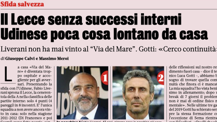 Gazzetta: Lecce in crisi in casa, Udinese in crisi in trasferta