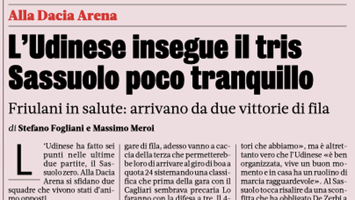 Il punto su Udinese-Sassuolo sulle pagine della Gazzetta.
