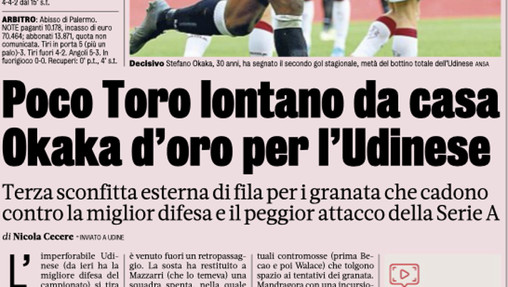 Il commento della Gazzetta alla vittoria dell'Udinese sul Torino.