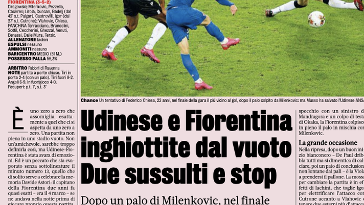 Gazzetta: Udinese e Fiorentina inghiottite dal vuoto