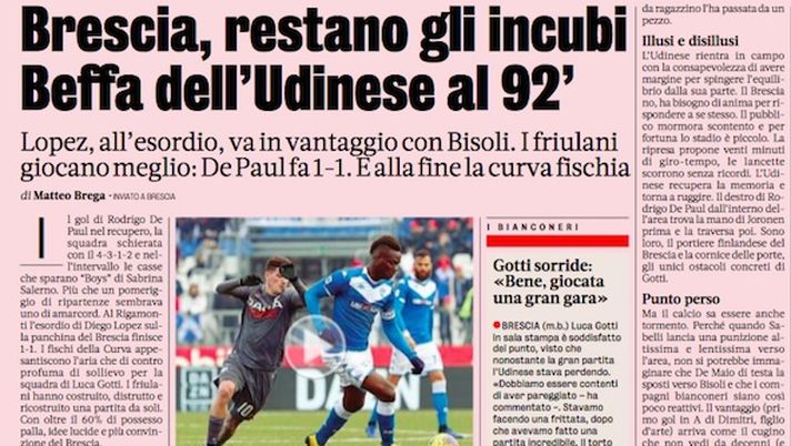 "Il gol di Rodrigo De Paul nel recupero, la squadra schierata con il 4-3-1-2 e nell’intervallo le casse che sparano “Boys” di Sabrina Salerno. Più che un pomeriggio di ripartenze sembrava uno di amarcord. Al Rigamonti l’esordio di Diego Lopez sulla panchina del Brescia finisce 1-1. I fischi della Curva appesantiscono l’aria che di contro profuma di sollievo per la squadra di Luca Gotti. I friulani hanno costruito, distrutto e ricostruito una partita da soli. Con oltre il 60% di possesso palla, idee lucide e più convinzione del Brescia".
