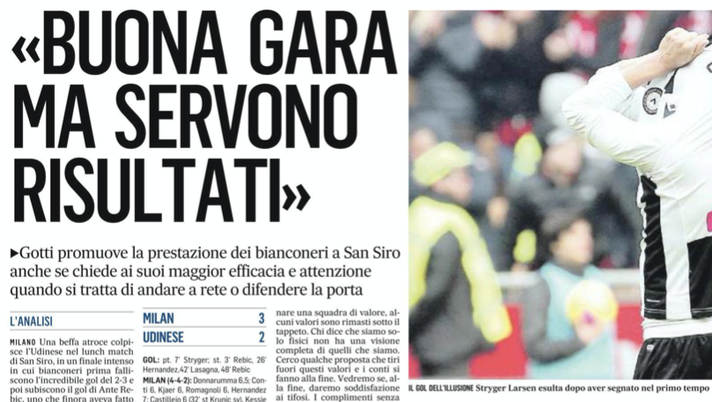 Il punto de Il gazzettino sull'Udinese uscita sconfitta col Milan.