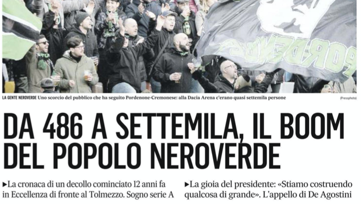 Il Gazzettino: Pordenone, il boom del popolo neroverde