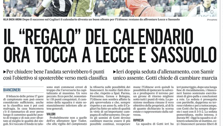 Il Gazzettino: Udinese, il regalo del calendario con Lecce e Sassuolo