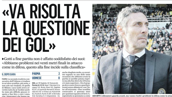 La seconda trasferta consecutiva dell'Udinese si traduce in un'altra sconfitta, più netta, e non solo nel risultato, di quella di Milano. Luca Gotti aveva avvertito tutti che al Tardini sarebbe stato più difficile giocare rispetto a San Siro e così è stato, con i bianconeri che hanno pagato a caro prezzo lo scarso cinismo sotto porta. Il Parma in versione svedese ha colpito con Gagliolo (a segno anche all'andata l'italo-scandinavo) e il talento Kulusevski, al quale ha spianato la strada del gol l'inopinato, e raro, errore di Juan Musso. Tanti episodi che hanno indirizzato i tre punti a restare a Parma e per questo l'allenatore dell'Udinese fatica a trovare una lettura definitiva: «Non riesco a dare una lettura di poca tranquillità. Abbiamo fatto una mezz'ora iniziale peggio del Parma, avevamo troppi pensieri sul come giocare invece di occuparci della sostanza. Paghiamo oltremodo due situazioni in area nostra che mettono la partita sul canale del Parma e nonostante un secondo tempo di livello non concretizziamo. L'ultimo step deve essere negli ultimi venti metri, concediamo poco e concretizziamo poco rispetto a quanto facciamo. Ekong? Ha avuto un problema muscolare, di cui non conosco ancora l'intensità».