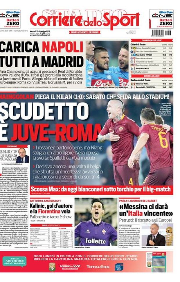 Le prime pagine dei quotidiani sportivi del 13 dicembre