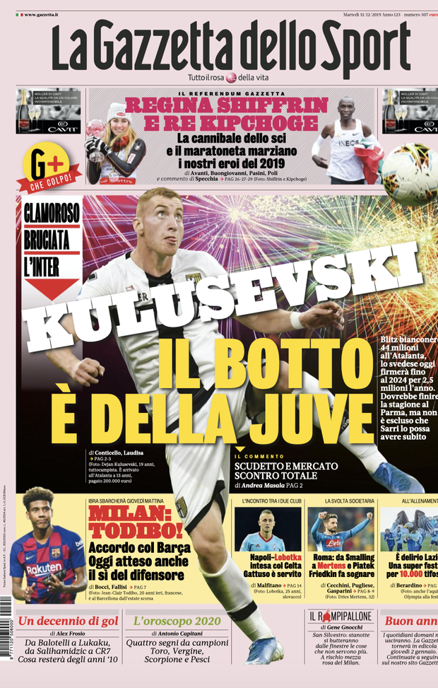 Le prime pagine di Gazzetta, Tuttosport e Corriere dello Sport del 31 dicembre 2019
