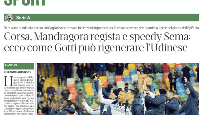 Ha corso quattro chilometri in più del Cagliari ed è riuscita nel duplice obiettivo di alzare il baricentro senza perdere equilibrio, mantenendo quindi la squadra compatta con i reparti corti tra loro. È stato soprattutto con questo atteggiamento, molto più propositivo rispetto alle sue ultime partite, che l'Udinese si è creata i presupposti per godersi un Natale sereno. L'effluvio di statistiche che hanno radiografato l'ultima sfida dell'anno ha poi confermato le sensazioni avute dal vivo e al tempo stesso ha stabilito alcuni parametri, una soglia "comportamentale" al di sotto della quale non sarà più consigliabile scendere, pena l'incorrere in prestazioni incolore come quelle con Lazio, Juventus e anche Sampdoria, tanto per citare alcune delle prestazioni double face dell'Udinese targata Gotti. Insomma, anche le statistiche aiutano a stilare pregi, difetti e potenzialità dei bianconeri, un compito a cui si è prestato anche Luca Pellegrini, spalla tecnica in veste di opinionista di Sky.AtteggiamentoLa prima riflessione dell'esperto ha riguardato proprio il modo di tenere il campo dell'Udinese, che in fase di possesso palla ha tenuto un baricentro alto, a 56.32 metri, arretrando a 44.42 quando la palla l'ha manovrata il Cagliari, alzando di 11 metri la linea difensiva rispetto a quanto aveva fatto col Napoli. «È la dimostrazione che il modulo c'entra meno dell'atteggiamento, perché è come i giocatori interpretano ciò che devono fare dalle posizioni di partenza che fa la differenza, e l'Udinese ha ritrovato la corsa in avanti». Pellegrini parla anche di corsa, fattore che riporta a un'analisi comparativa importante, perché i 114 chilometri percorsi complessivamente dall'Udinese non solo sono stati superiori ai 110 del Cagliari, ma hanno fissato anche la miglior performance nelle 7 partite della gestione Gotti. Resta valido il presupposto che nel calcio bisogna saper correre, ma fa specie notare che la Spal a Udine percorse 109 chilometri rispetto ai 104 dei bianconeri, inferiori anche a Genova con la Samp (110/106).