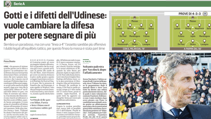 «Ho pensato di iniziare qualche partita con la difesa a quattro»: la confessione è stata firmata da Luca Gotti prima di incrociare l'Inter, un'ammissione che non è passata inosservata e che è quanto mai di moda per l'Udinese dopo la seconda gara di fila senza neppure un gol nella casella di quelli segnati, dopo aver visto che la mossa della "difesa a 4" nei finali delle ultime tre gare, con l'idea di costruire una rimonta. Una rimonta che i bianconeri sono riusciti ad abbozzare a San Siro contro il Milan, quando hanno pareggiato il conto prima di arrendersi all'ultimo minuto all'ennesimo (il terzo) gol rossonero. Nelle altre due, con Parma e Inter, l'Udinese ha alzato il baricentro del gioco, non ha raccolto molto, ma non ha neppure subito una rete dagli avversari, segno che il famoso equilibrio tattico - il dubbio quando si tratta di cambiare modulo - non viene alterato dalla "linea a 4".LA CronologiaInsomma, può sembrare un paradosso, ma Gotti ha pensato di cambiare le carte in tavola a livello difensivo per segnare di più. Sì, perché smontando il 3-5-2 per passare a un 4-3-3 (e alle sue possibili varianti, dal 4-1-4-1 al 4-2-3-1), il tecnico di Contarina punta ad avere un maggior impatto offensivo. Ed è un pensiero che ha cavalcato già a Lecce, quando nel finale di partita allo stadio di Via del Mare, inserì Pussetto per avere un esterno d'attacco in più e anche grazie a questo coraggio fu premiato con la rete di Rodrigo De Paul nel finale di gara. Ma la presenza di Pussetto che, nel frattempo, è stato spedito al Watford, visto che qui fungeva esclusivamente da arma tattica, non è decisivo, stando a quello che ha fatto capire lo stesso Gotti. (...)