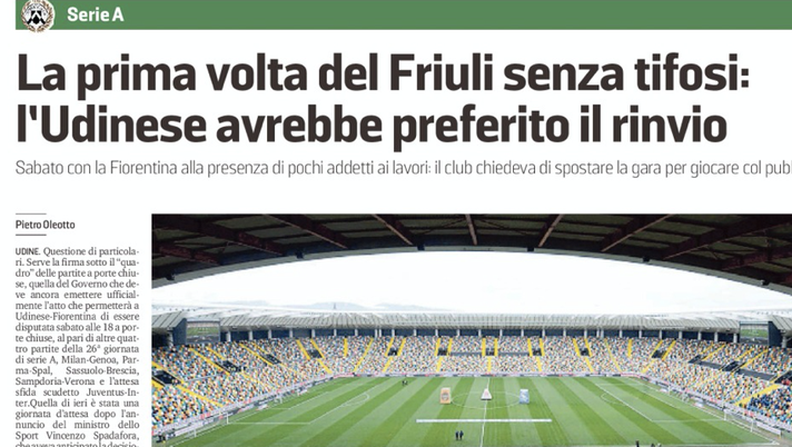 Messaggero veneto: La prima volta del Friuli senza tifosi: l’Udinese avrebbe preferito il rinvio