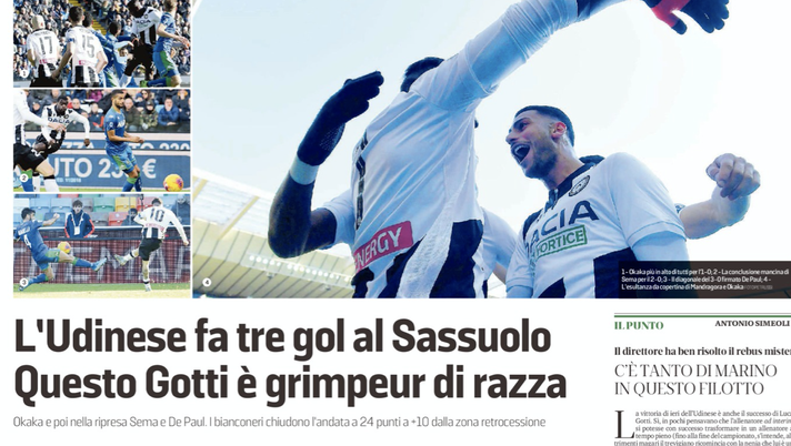 Messaggero Veneto: L’Udinese fa tre gol al Sassuolo Questo Gotti è grimpeur di razza