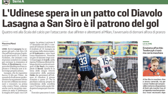 Kevin Lasagna ha segnato più gol a San Siro (4) che nell'intero girone d'andata di quest'anno (3). E allora l'Udinese, che domani a ora di pranzo scenderà in campo per rovinare la domenica al Milan di Ibrahimovic, si augura che il feeling tra il suo capitano e il Meazza non si interrompa proprio adesso.Lasagna, che da ragazzino faceva il tifo per l'Inter, da quando fa il calciatore professionista ha equamente diviso le sue reti a Milano tra nerazzurri e rossoneri. La prima volta contro l'Inter, coincise anche con la sua prima marcatura in serie A (indossava la maglia del Carpi): era il 24 gennaio, la squadra allenata dall'attuale ct dell'Italia Roberto Mancini era in vantaggio grazie a una rete di Palacio e gli emiliani erano rimasti in dieci per l'espulsione di Pasciuti. Il definitivo 1-1 arriverà in contropiede: palla filtrante, Juan Jesus in ritardo sul futuro bianconero abile a incrociare il sinistro per superare Handanovic. Gol indimenticabile per Kevin che poi si è ripetuto alla sua prima gara a San Siro con la maglia dell'Udinese ma contro il Milan: fu la rete del momentaneo 1-1 in una gara che vide protagonista Kalinic autore di una doppietta che resterà una delle poche note piacevoli della sua esperienza in rossonero.Sono risultate decisamente più pesanti e gratificanti le altre due perle milanesi di Lasagna. La prima è arrivata il 17 dicembre del 2017 e consentì all'Udinese di sbloccare il risultato al 14: Lasagna su un'azione dalla destra anticipò D'Ambrosio e mise fuori causa Handanovic. Neanche un giro di lancette dopo arrivò il pareggio di Icardi, nella ripresa l'Udinese effettuò l'allungo decisivo con le reti su rigore di De Paul e in contropiede di Barak. Quella fu la terza delle cinque vittorie consecutive della gestione Oddo che permisero all'Udinese di chiudere il girone d'andata a quota 27. (...)