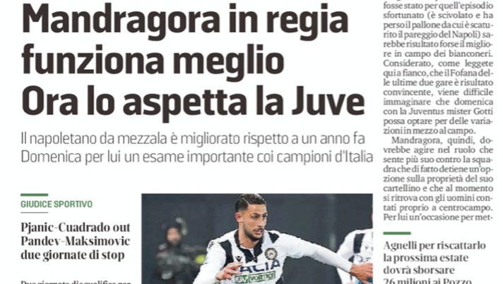 Quando arrivò a Udine, l'ex dt Daniele Pradè, l'uomo che più di tutti in casa friulana voleva Rolando Mandragora, disse: «Abbiamo preso il regista del futuro». Chi lo aveva allenato a Pescara, Massimo Oddo, ha sempre sostenuto: «In un centrocampo a tre può fare solo il centrale davanti alla difesa, non è una mezzala». Delle 41 partite giocate in campionato con la maglia dell'Udinese il centrocampista napoletano ne ha giocate di più sicuramente da mezzala che da regista. Lo scorso anno sulla sua strada c'era Behrami, quest'anno in quel ruolo sono arrivati Jajalo e Walace. Complice l'infortunio del bosniaco e la prova tutt'altro che confortante del brasiliano con la Lazio, Rolando è stato proposto da Gotti, prima con il Bologna e poi in campionato con il Napoli, davanti alla difesa. «A me il ragazzo è piaciuto», disse Gotti dopo la gara di Coppa Italia. Sabato scorso Mandragora si è ripetuto e se non fosse stato per quell'episodio sfortunato (è scivolato e ha perso il pallone da cui è scaturito il pareggio del Napoli) sarebbe risultato forse il migliore in campo dei bianconeri. Considerato, come leggete qui a fianco, che il Fofana delle ultime due gare è risultato convincente, viene difficile immaginare che domenica con la Juventus mister Gotti possa optare per delle variazioni in mezzo al campo.