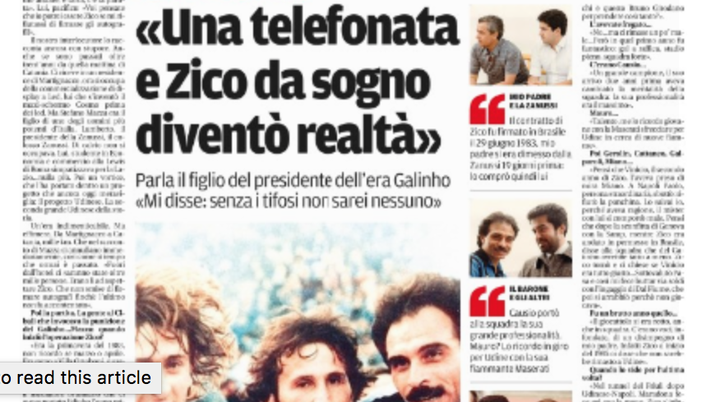 Poi? «Giuliodori chiese alla reception di passargli una telefonata in Brasile. Parlò un paio di minuti col campione e ci disse: bene, Zico è disponibile a trattare con l’Udinese».