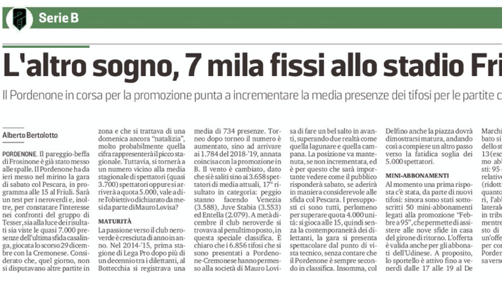 Messaggero Veneto: Pordenone l’altro sogno, 7 mila fissi allo stadio Friuli