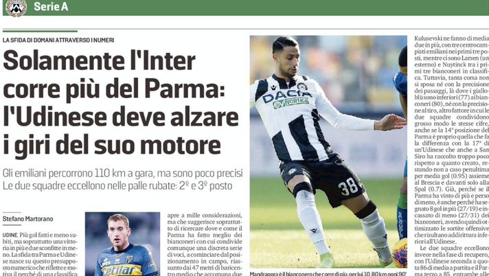 Più gol fatti e meno subiti, ma soprattutto una vittoria in più e due sconfitte in meno. La sfida tra Parma e Udinese nasce su questo presupposto numerico che riflette e motiva il perché di una classifica in cui gli emiliani si stanno "abbronzando" al settimo posto, a due punti dal caldo riflesso della zona Europa League, mentre l'Udinese è 14ª, a soli quattro punti dai crociati. Sette posizioni di differenza sono dunque raccolte in soli quattro punti, un dato che apre a mille considerazioni, ma che suggerisce soprattutto di ricercare dove e come il Parma ha fatto meglio dei bianconeri con cui condivide comunque una discreta serie di voci, a cominciare dal posizionamento in campo, riassunto dai 47 metri di baricentro medio che accomuna due squadre dedite al caro e vecchio contropiede e non certo al predominio del gioco di possesso. È proprio nello sviluppo delle azioni che bisogna quindi cercare, a partire dal solco creato dagli emiliani sulla corsa, sul dinamismo, là dove il Parma di D'Aversa risulta la seconda squadra del campionato in chilometri percorsi, a quota 110 di media a partita, due in meno dell'Inter di Conte, uno in più della Juve, Verona, Lecce e Atalanta, ma soprattutto quattro in più dei bianconeri di Gotti, appena in 15ª posizione. Correre però non basta, bisogna vedere come e con chi si corre, e qui la specifica individuale dice che se nell'Udinese il top runner è il centrocampista Mandragora (10.86 km.), Kurtic e Kulusevski ne fanno di media due in più, con tre centrocampisti emiliani nei primi tre posti, mentre ci sono Larsen (un esterno) e Nuytinck tra i primi tre bianconeri in classifica. (...)