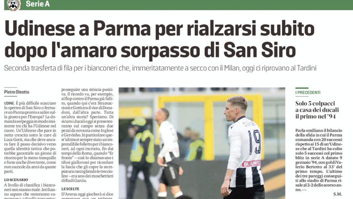 Messaggero Veneto: Udinese a Parma per rialzarsi subito dopo l’amaro sorpasso di San Siro